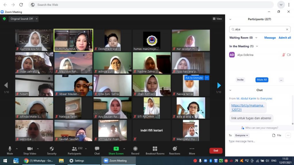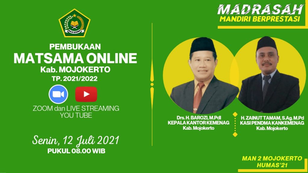 Pembukaan Matsama ini dilaksanakan secara daring dengan media Zoom Meeting juga live streaming. Pelaksanaan pembukaan Matsama se-kab Mojokerto tingkat RA/MTs/MA dibuka langsung oleh Kepala Kantor Kementerian Agama Kab. Mojokerto. “Selamat datang siswa/siswi baru Madrasah, kalian sebagai generasi bangsa yang mempunyai bekal ilmu keagamaan karena masuk ke madrasah. Di Madrasah selain memperoleh ilmu agama juga memperoleh ilmu umum, kegiatan Matsama ini dilaksanakan secara daring karena kita masih dalam masa pandemi covid 19 dan pemberlakukan PPKM Darurat,” Ungkap Barozi dalam sambutannya.