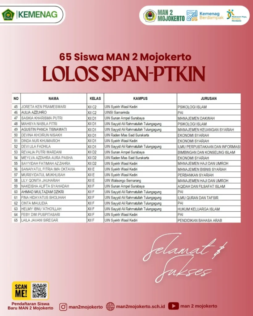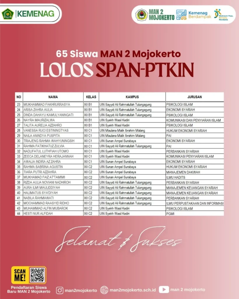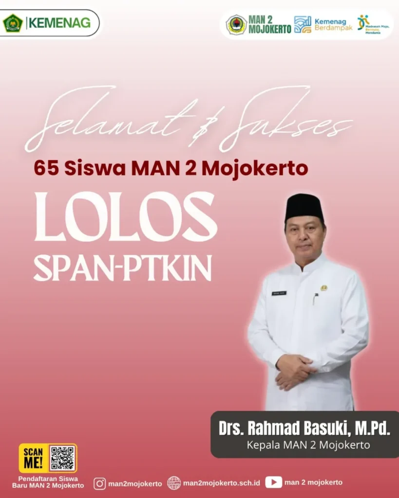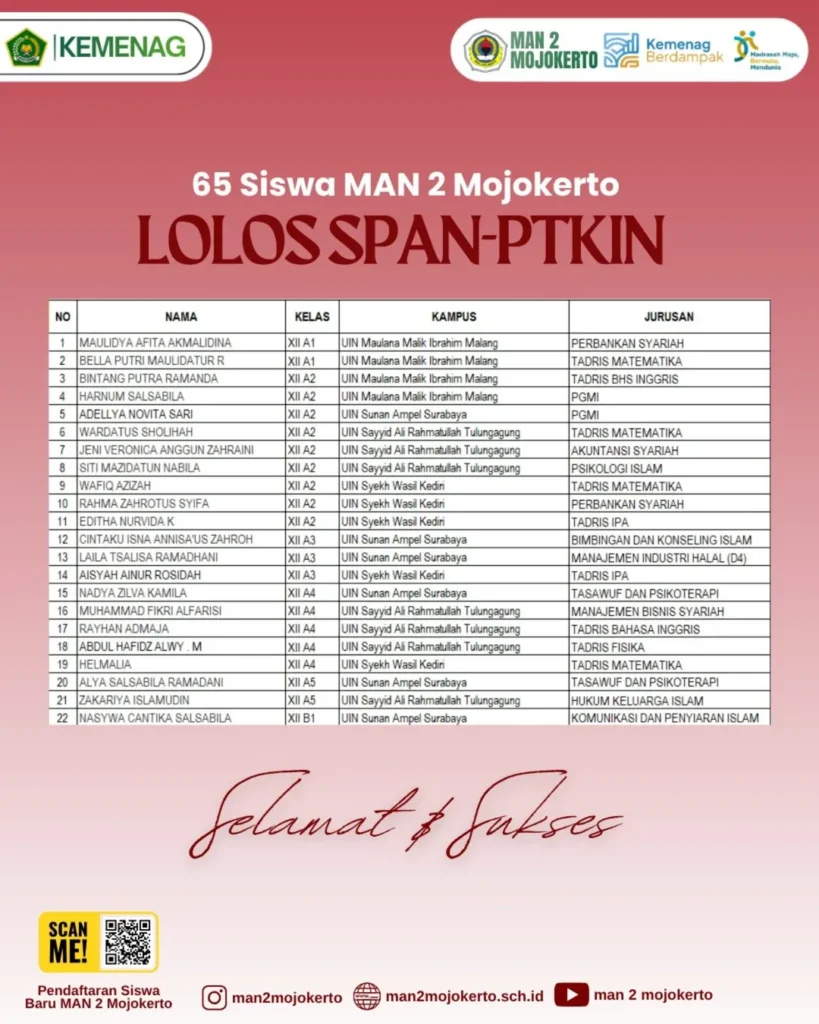 Kab Mojokerto – Kabar membanggakan kembali datang dari MAN 2 Mojokerto. Sebanyak 65 siswa berhasil lolos Seleksi Prestasi Akademik Nasional Perguruan Tinggi Keagamaan Islam Negeri (SPAN-PTKIN) tahun 2026. Capaian ini menjadi bukti nyata konsistensi madrasah dalam mengantarkan peserta didiknya melanjutkan pendidikan ke jenjang perguruan tinggi, khususnya di lingkungan PTKIN.