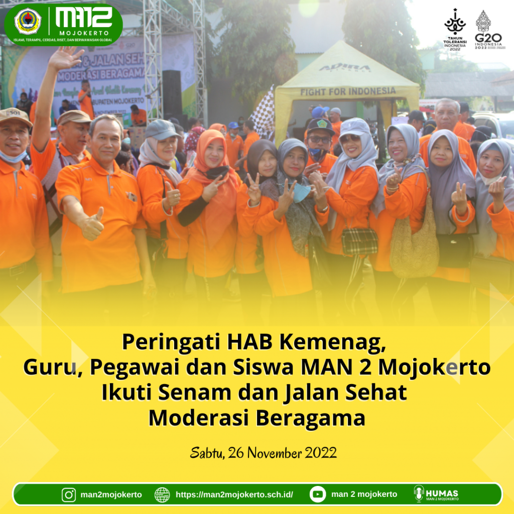 Guru, Pegawai dan Siswa MAN 2 Mojokerto mengikuti Senam dan Jalan sehat Moderasi beragama yang diselenggarakan oleh Kantor Kementerian Agama Kabupaten Mojokerto, hari ini (26/11) di Kantor Kemenag Kab. Mojokerto.