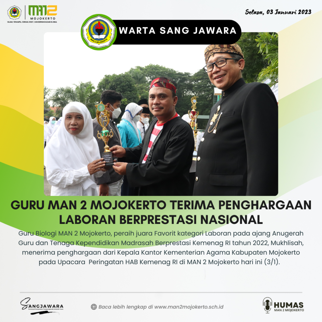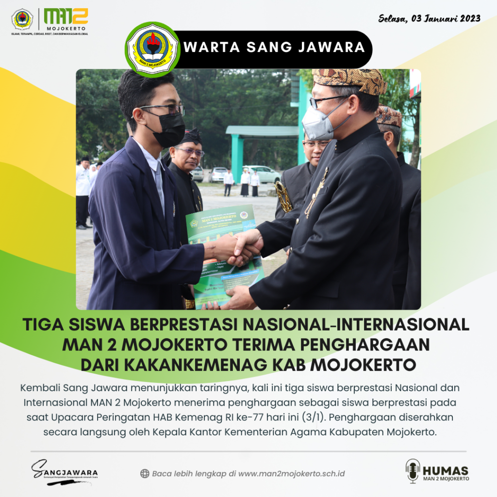 Kembali Sang Jawara menunjukkan taringnya, kali ini tiga siswa berprestasi Nasional dan Internasional MAN 2 Mojokerto menerima penghargaan sebagai siswa berprestasi pada saat Upacara Peringatan HAB Kemenag RI ke-77 hari ini (3/1). Penghargaan diserahkan secara langsung oleh Kepala Kantor Kementerian Agama Kabupaten Mojokerto.