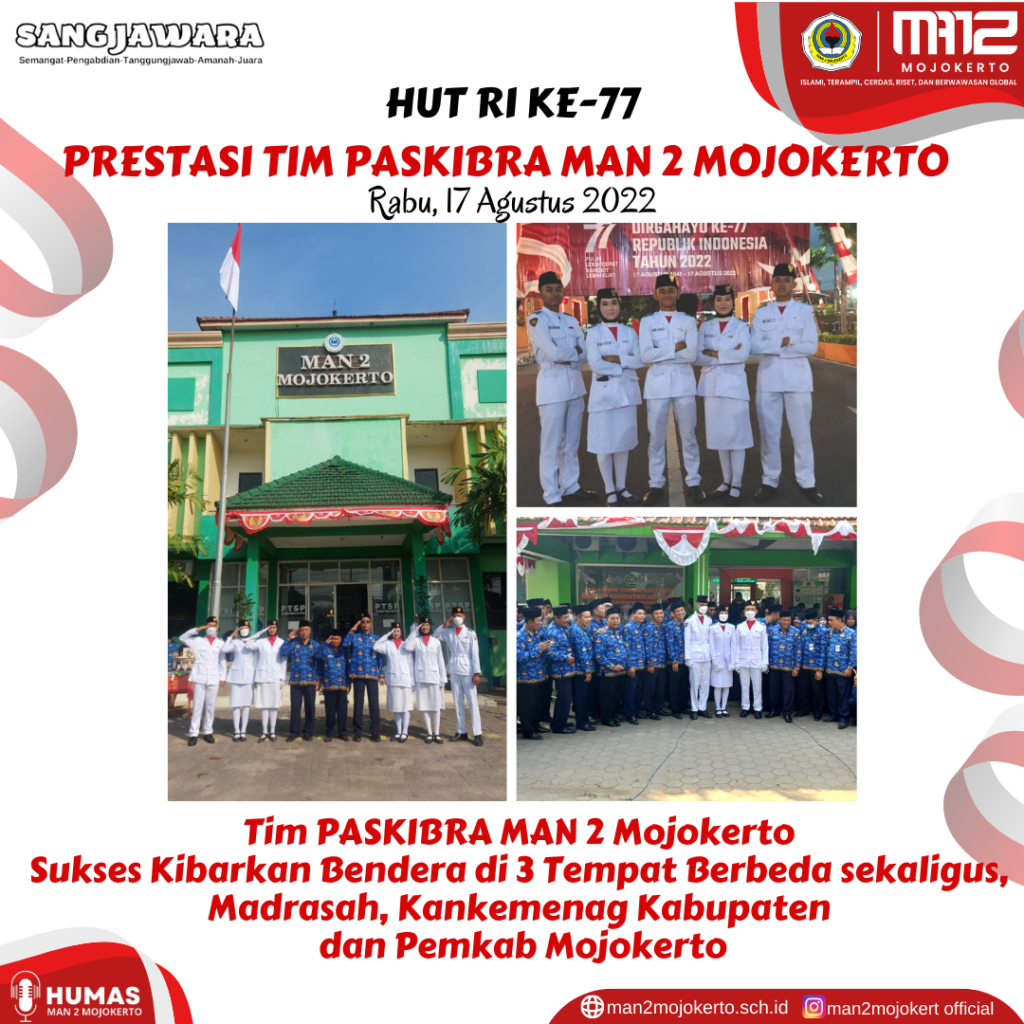 Tim Pasukan Pengibar Bendera (Paskib) MAN 2 Mojokerto hari ini (17/8) telah sukses mengibarkan bendera di 3 (tiga) tempat berbeda sekaligus, yaitu di pendopo kabupaten, Kantor Kementerian Agama (KanKemenag) Kabupaten Mojokerto dan di madrasah sendiri.
