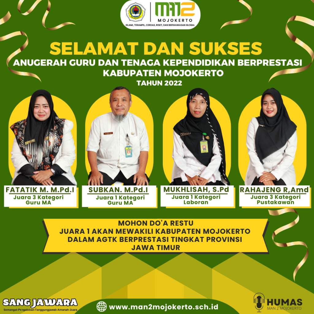 Guru dan Tenaga Kependidikan (GTK) Madrasah Aliyah Negeri (MAN) 2 Mojokerto memborong piala dalam ajang Anugerah Guru dan Tenaga Kependidikan (AGTK) berprestasi Kementerian Agama Kabupaten Mojokerto Tahun 2022