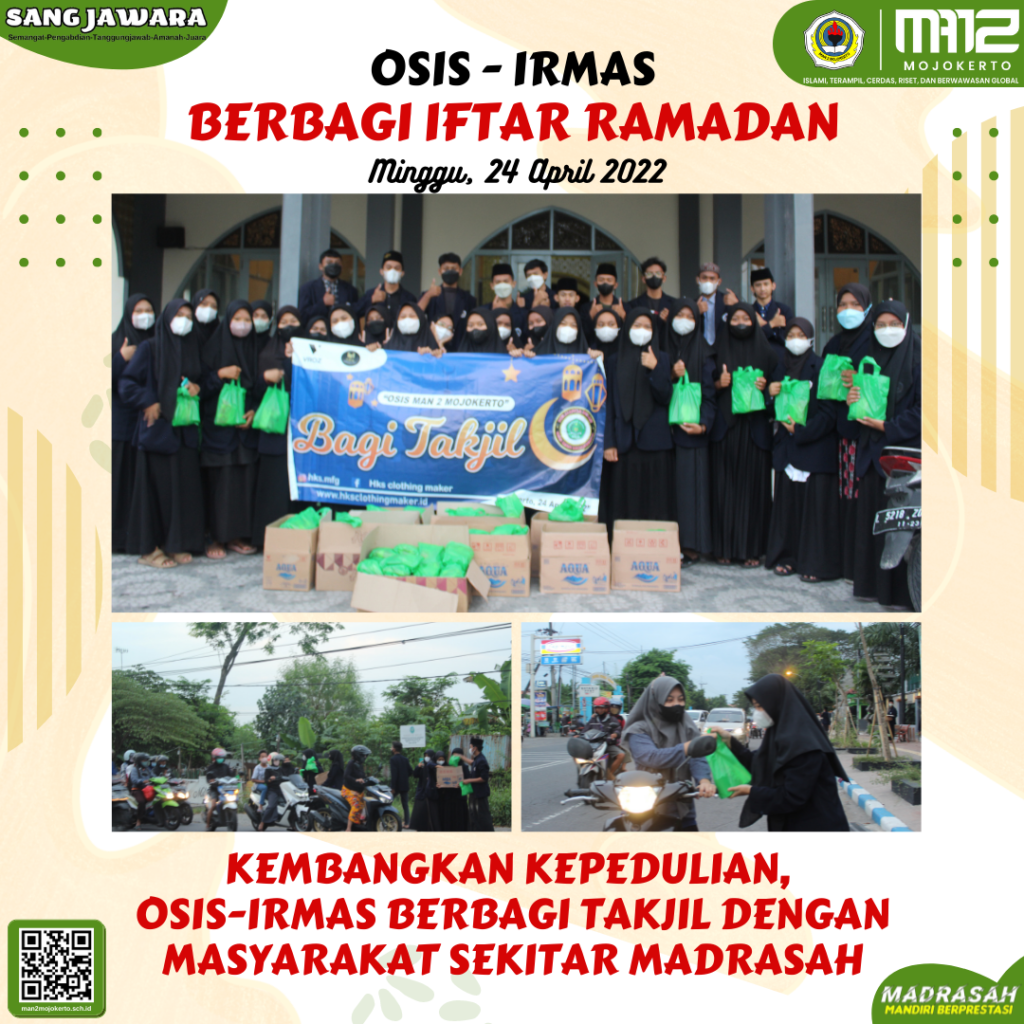 OSIS (Organisasi Siswa Intra Sekolah) dan IRMAS (Ikatan Remaja Masjid) Ulul Al-Bab MAN 2 Mojokerto membagikan ratusan takjil pada masyarakat sekitar madrasah kemarin (24/2).