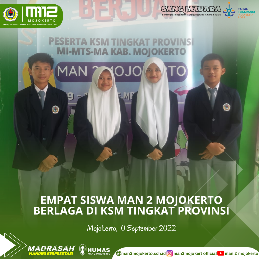 Empat siswa dari MAN 2 Mojokerto yang mengikuti KSM kali ini adalah Ahmad Nizar Saputra dan Arif Rahman Hakim A mengikuti kompetisi bidang Matematika Terintegrasi, Fadilla Aulia C mengikuti kompetisi bidang Biologi Terintegrasi, Alicia Nadine mengikuti kompetisi bidang Kimia terintregrasi.
