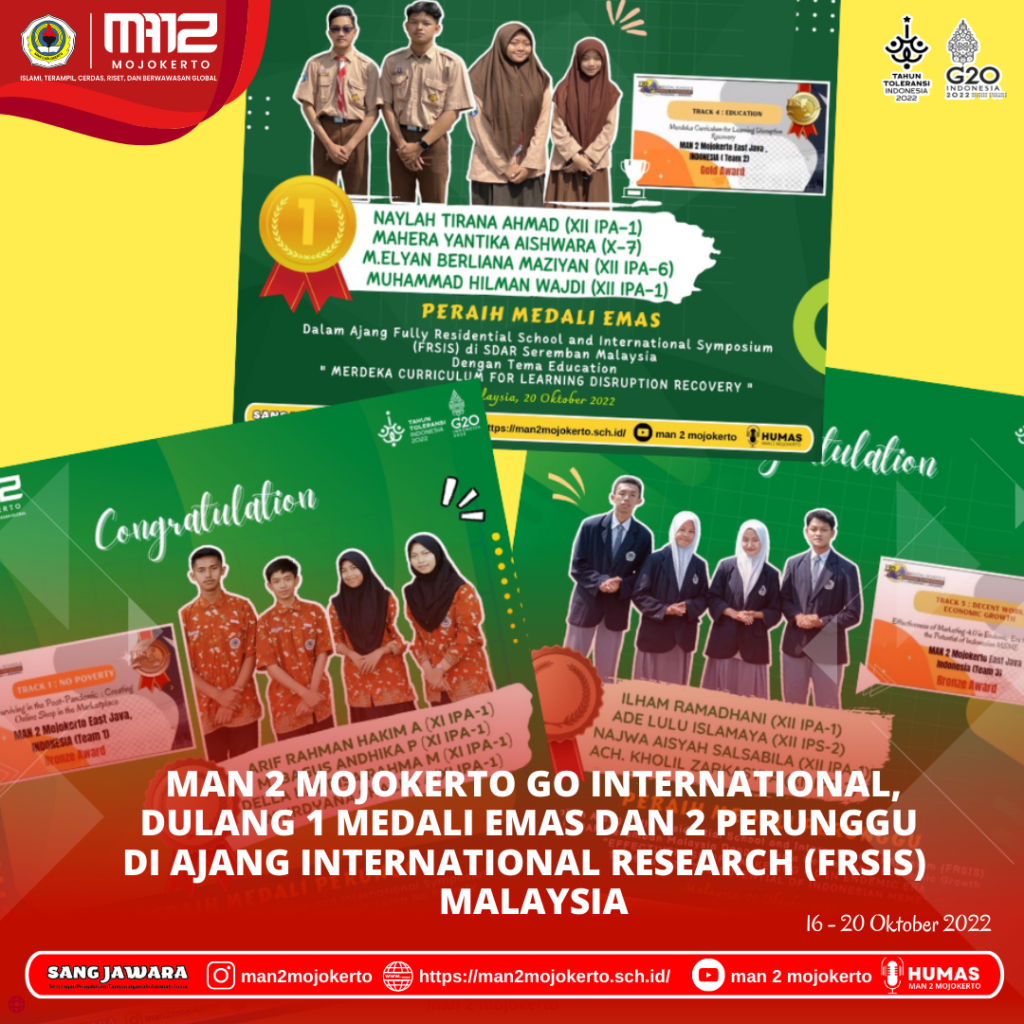 Kab. Mojokerto (MAN 2 Mojokerto) Siswa MAN 2 Mojokerto kembali berjaya di ajang Internasional. Kali ini di Event 10th Fully Resedential Schools International Symposium 2022 (FRSIS) di Malaysia. MAN 2 Mojokerto memperoleh 1 (satu) medali Emas dan 2 (dua) medali perunggu.