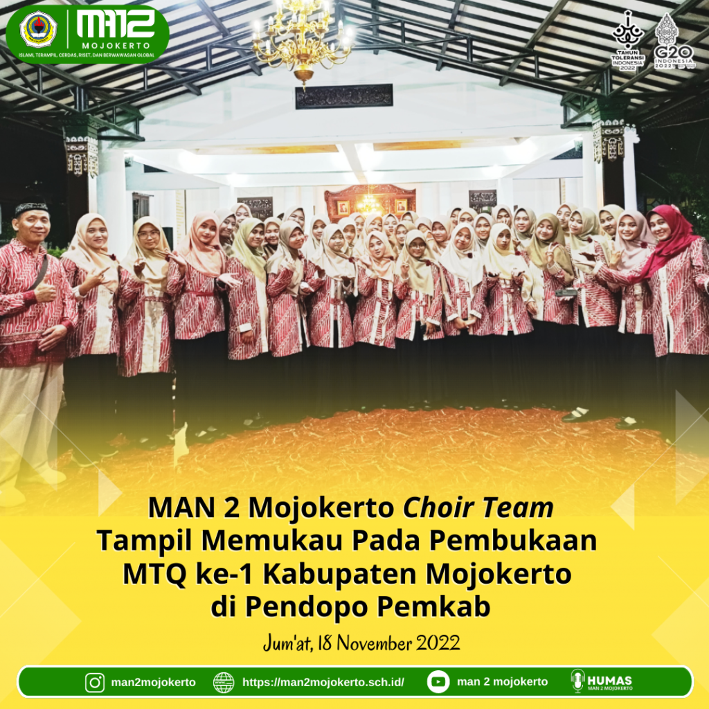 ada acara pembukaan Musabaqoh Tilawatil Qur’an (MTQ) Kabupaten Mojokerto ke-1 pada hari ini (18/11) di Graha Majatama Pemkab Mojokerto, Tim Paduan Suara MAN 2 Mojokerto kembali dipercaya untuk tampil dan menunjukkan kebolehannya. Pada kesempatan tersebut, MAN 2 Mojokerto Choir team membawakan 2 (dua) lagu, yaitu Indonesia Raya dan Mars MTQ. Tim paduan suara MAN 2 Mojokerto tampil memukau dengan seragam warna merah dipadu dengan hijab coklat muda membuat siswa tampil cantik dan berseri-seri di depan kamera. Acara Pembukaan MTQ Ke-1 Kabupaten Mojokerto dibuka langsung oleh Bupati Mojokerto, Ikfina Fahmawati dan dihadiri oleh Forkopimda dan Kepala Kantor Kementerian Agama Kabupaten Mojokerto, Barozi.