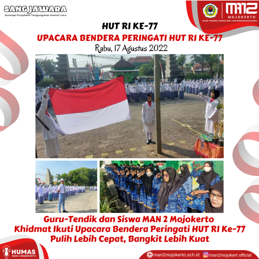Madrasah Aliyah Negeri 2 Mojokerto mengikuti kegiatan upacara dalam rangka peringatan HUT RI ke-77. Kegiatan ini dilaksanakan pada hari Rabu (17/8). Dengan pemberlakuan PPKM kegiatan upacara ini dilaksanakan di Madrasah dengan diikuti seluruh Bapak/Ibu guru berserta staf Tata usaha serta menerapkan protokol kesehatan, bertempat di lapangan depan madrasah