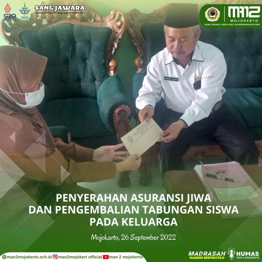 Kepala Madrasah Aliyah Negeri 2 Mojokerto melalui Wakil Kepala madrasah bidang Kesiswaan Bambang Ismono menyerahkan asuransi kecelakaan dan pengembalian tabungan siswa pada keluarga Endah Karunia Sujilia (kelas XI IPA 1) yang meninggal karena kecelakaan saat berangkat ke madrasah pada tanggal 17 Juni 2022 lalu.
