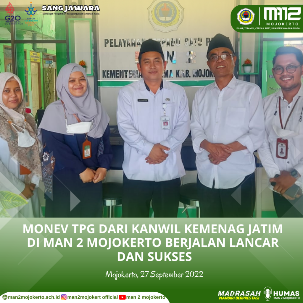 Monitoring dan Evaluasi Penggunaan Simpatika dan TPG (Tunjangan Profesi Guru) Tahun Anggaran 2022 yang dilakukan oleh Tim dari Seksi Guru dan Tenaga Kependidikan (GTK) Pendidikan Madrasah Kantor Wilayah Kementerian Agama Provinsi Jawa Timur, hari ini (27/9) di MAN 2 Mojokerto berjalan lancar dan sukses.