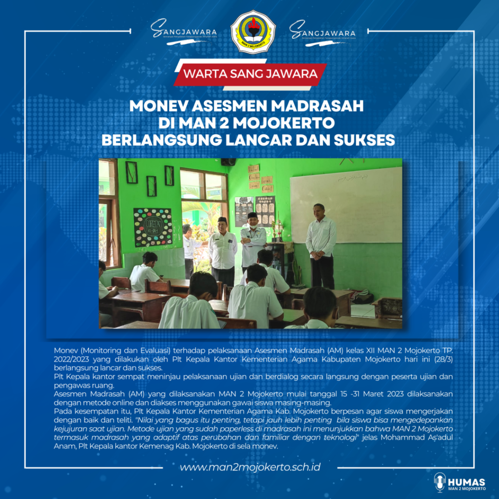 Monev (Monitoring dan Evaluasi) terhadap pelaksanaan Asesmen Madrasah (AM) kelas XII MAN 2 Mojokerto TP. 2022/2023 yang dilakukan oleh Plt Kepala Kantor Kementerian Agama Kabupaten Mojokerto hari ini (28/3) berlangsung lancar dan sukses.