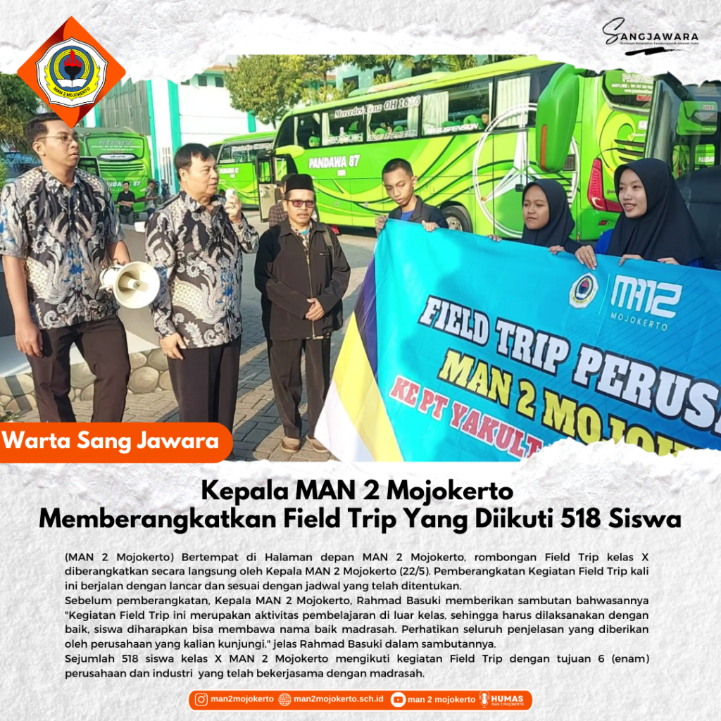 Sejumlah 518 siswa kelas X MAN 2 Mojokerto mengikuti kegiatan Field Trip dengan tujuan 6 (enam) perusahaan dan industri yang telah bekerjasama dengan madrasah.