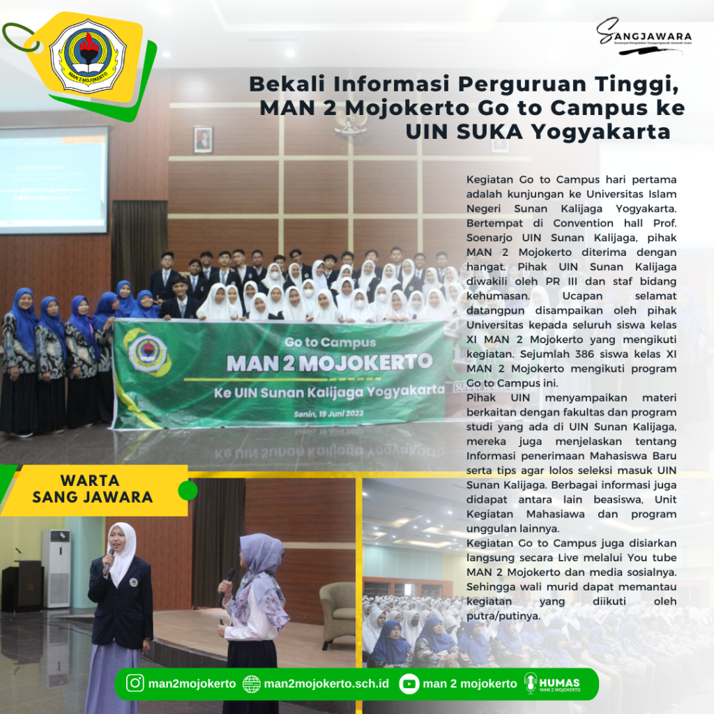 Madrasah Aliyah Negeri 2 Mojokerto melaksanakan kegiatan Go to Campus. Kegiatan ini dilaksanakan pada hari Senin – Selasa (19-20/6). Pelaksanaan Go to Campus diikuti oleh kelas XI TP. 2022/2023.