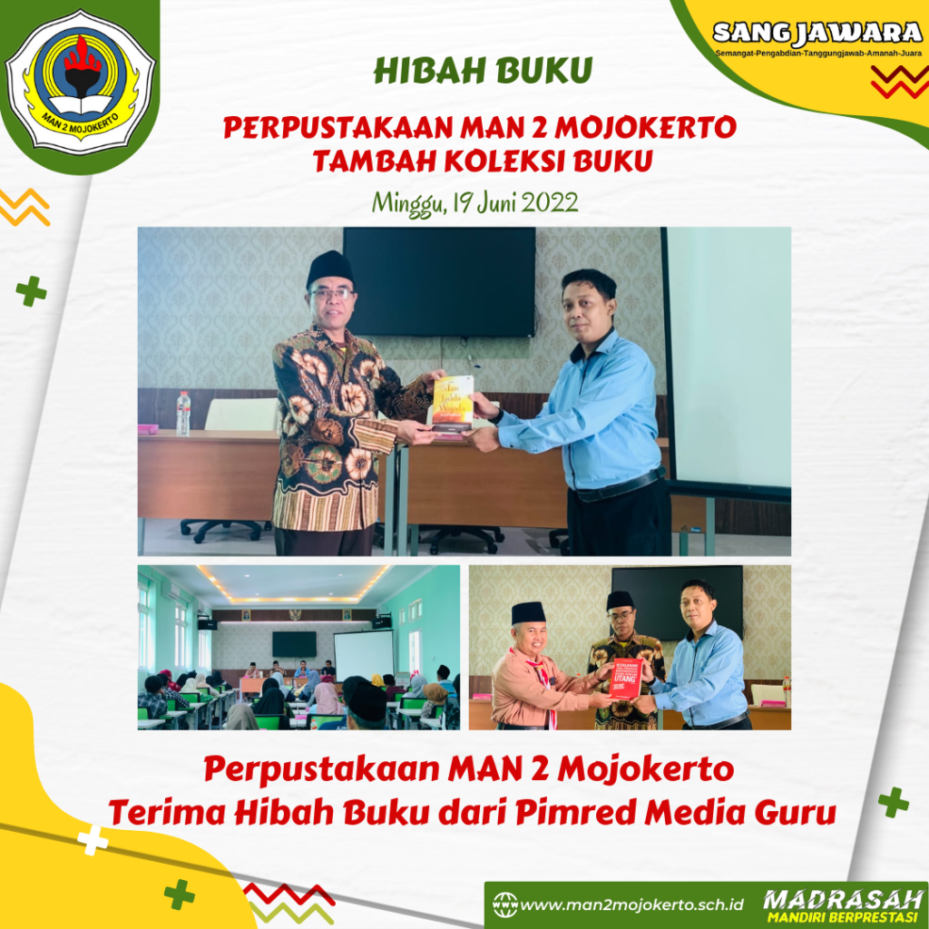Perpustakaan Madrasah Aliyah Negeri 2 Mojokerto berkesempatan menerima hibah buku dari Pimpinan Redaksi (Pimred) Media Guru. Hibah buku ini langsung diberikan oleh Pimred kepada pihak madrasah. Pemberian hibah buku ini dilaksanakan pada hari Minggu (19/6) bertempat di Aula Asrama MAN 2 Mojokerto.