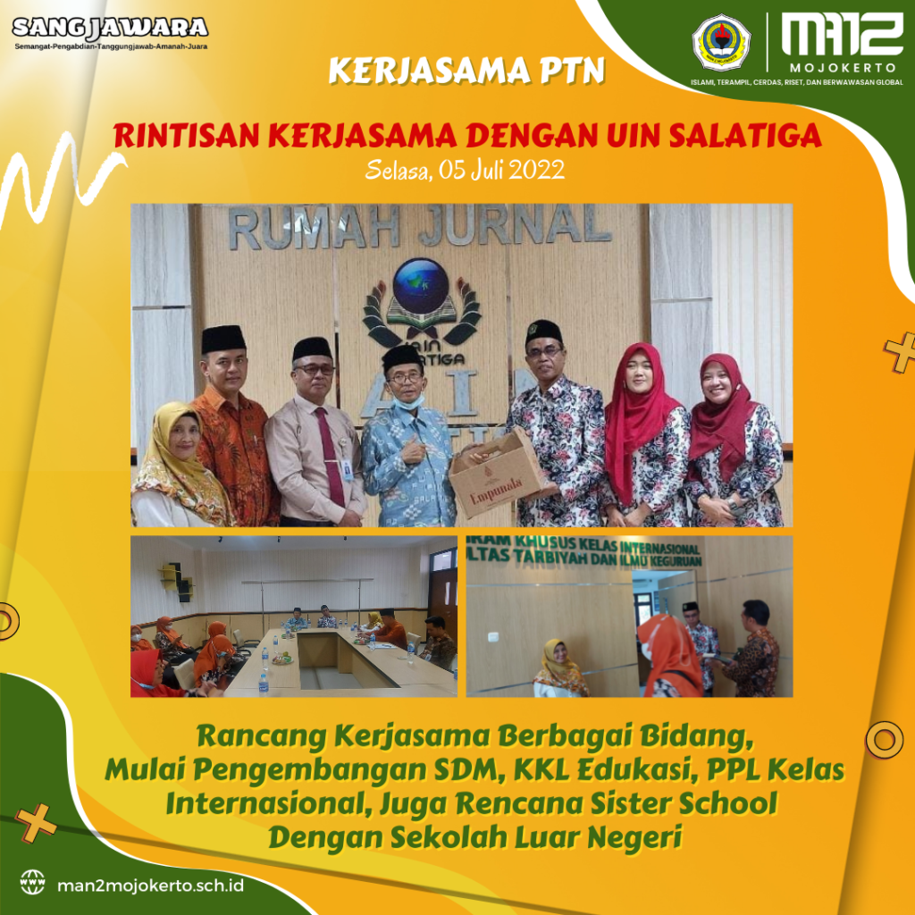 Dalam pembicaraan kemarin telah disepakati beberapa kerjasama yang akan dilakukan antara MAN 2 Mojokerto dan UIN Salatiga, diantaranya Penerimaan Mahasiswa Baru Jalur Khusus, Pembimbingan penulisan KTI/PTK/jurnal, Kunjungan KKL Edukasi dan PPL program Kelas Khusus Internasional (KKI).