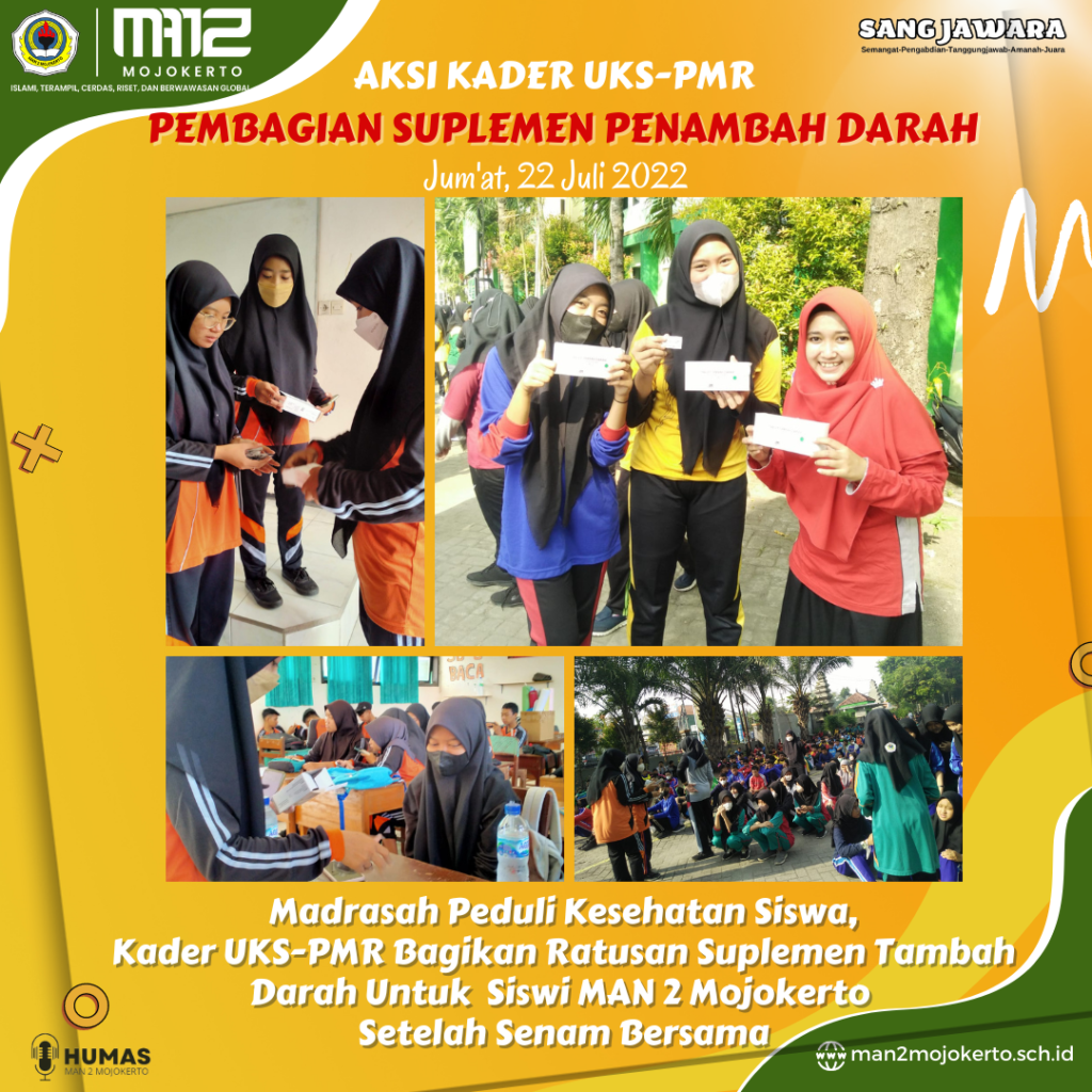 Kab. Mojokerto (MAN 2 Mojokerto) Ratusan suplemen atau vitamin penambah darah dibagikan pada siswi atau pelajar putri MAN 2 Mojokerto pada hari Jum’at (22/7) setelah senam bersama guru, Pegawai dan seluruh siswa.