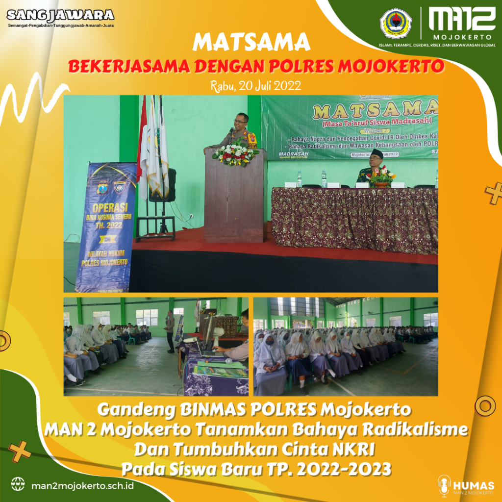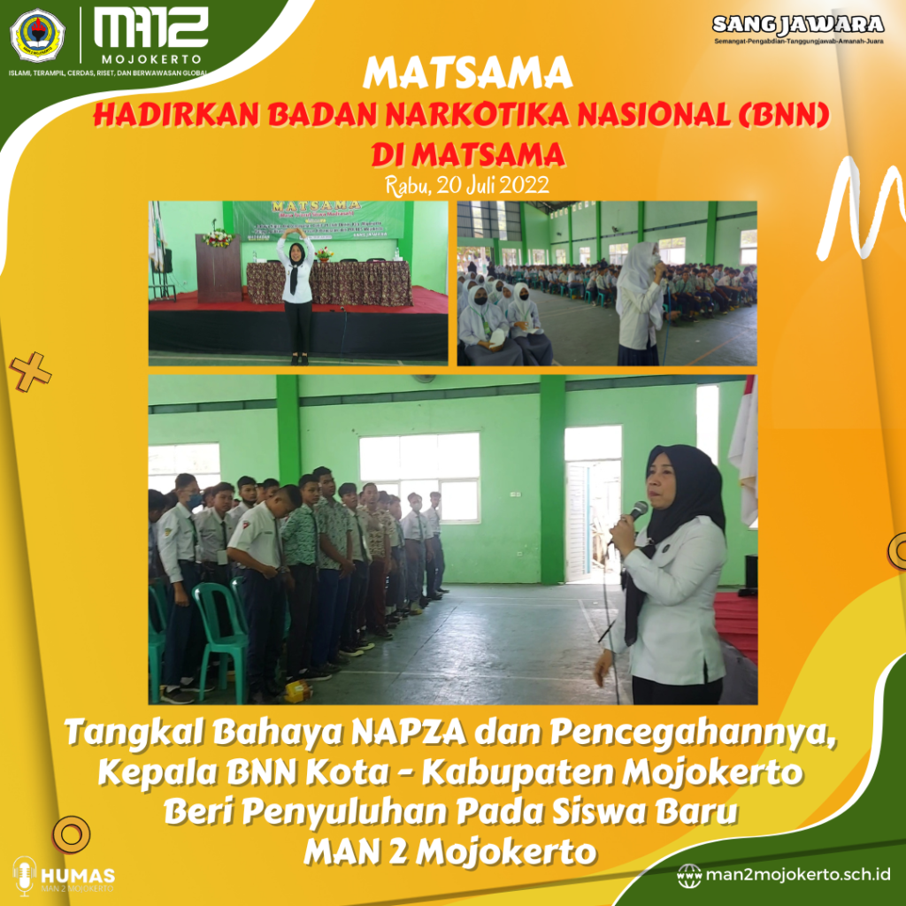 Untuk itulah materi tentang Bahaya Napza untuk remaja dimasukkan menjadi salah satu materi penting dalam Masa Ta’aruf Siswa Madrasah (Matsama) MAN 2 Mojokerto TP. 2022-23.