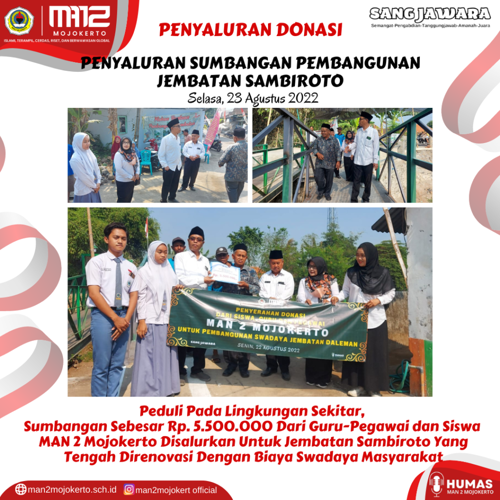 Donasi yang dikumpulkan oleh siswa, guru dan pegawai MAN 2 Mojokerto untuk pembangunan jembatan Sambiroto yang dibangun atas Swadaya masyarakat, hari Selasa kemarin (23/8) telah disalurkan.
