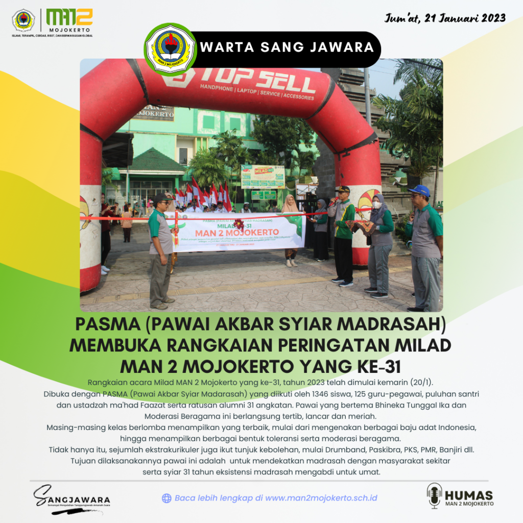 Rangkaian acara Milad MAN 2 Mojokerto ke-31 tahun 2023 telah dimulai kemarin (20/1). Dibuka dengan PASMA (Pawai Akbar Syiar Madarasah) yang diikuti oleh 1346 siswa, 125 guru-pegawai, puluhan santri dan ustadzah ma’had Faazat serta ratusan alumni 31 angkatan.