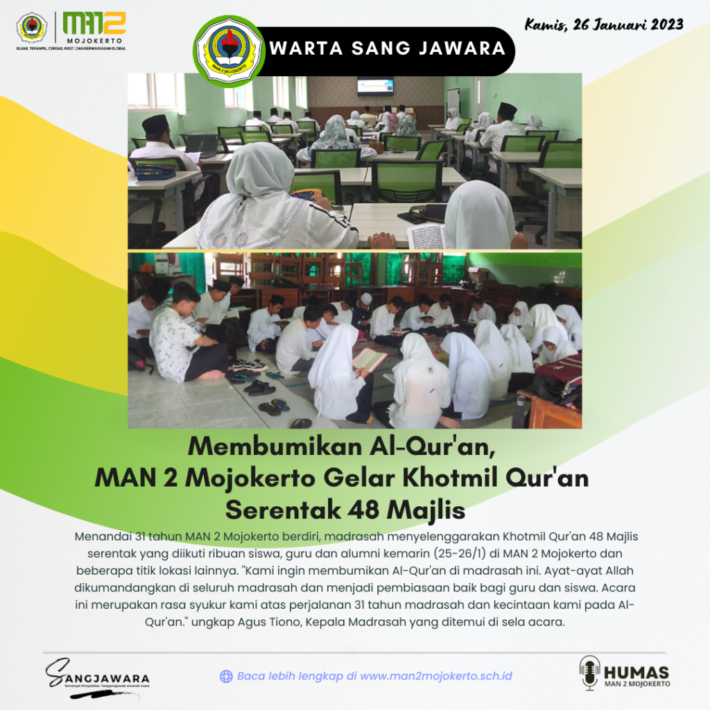 Kab. Mojokerto (MAN 2 Mojokerto) Menandai 31 tahun MAN 2 Mojokerto berdiri, madrasah menyelenggarakan Khotmil Qur’an 48 Majlis serentak yang diikuti ribuan siswa, guru dan alumni kemarin (25-26/1) di MAN 2 Mojokerto dan beberapa titik lokasi lainnya.