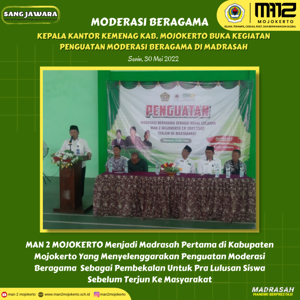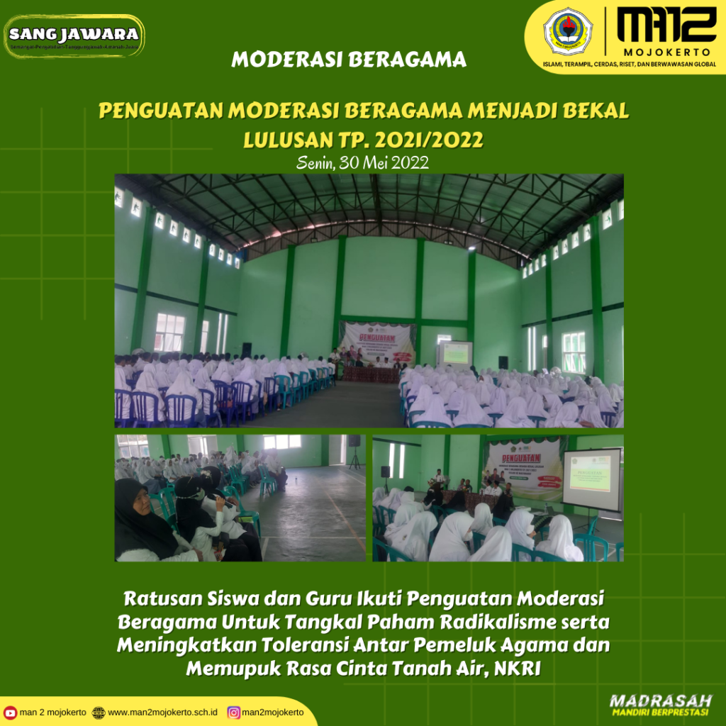 Kab. Mojokerto (MAN 2 Mojokerto) Madrasah Aliyah Negeri 2 Mojokerto mengadakan penguatan moderasi beragama kepada siswa kelas XII. Bertempat di Gedung Indoor MAN 2 Mojokerto, hari ini Senin (30/5) siswa […]